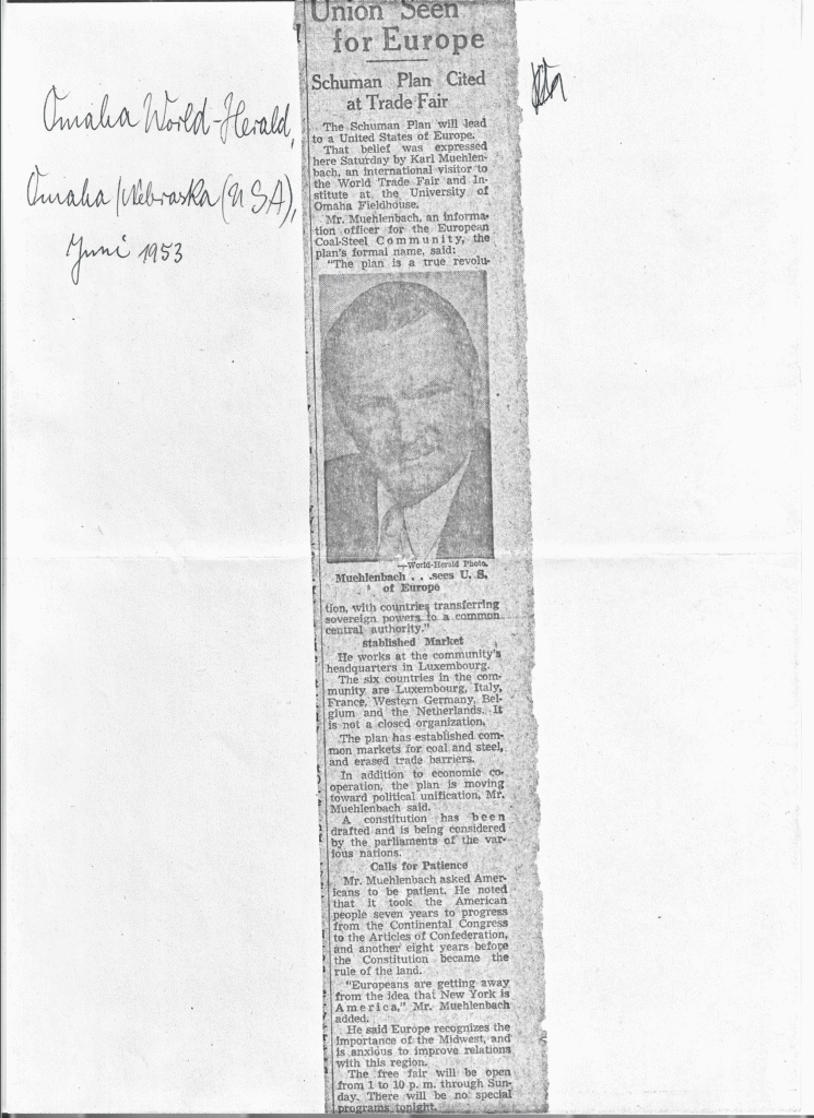 Gemäss dem letzten Willen meines Vaters hatte ich im Jahr 2010 seinen dokumentarischen Nachlass, der vor allem historische Pressefotos aus der Entstehungszeit der Europäischen Gemeinschaft enthält, nach Lausanne gebracht und der Stiftung „Fondation Jean Monnet pour l’Europe“ übergeben. Diese Stiftung betreut und verwaltet ein öffentlich zugängliches Archiv, welches Anfragen von Fachleuten und Studierenden aus der ganzen Welt erhält. Die damals zuständige Archivarin, Madame Nicod, erkannte sofort den grossen Wert des Nachlasses meines Vaters, der den Nachlass von Jean Monnet sehr gut ergänzt, und eröffnete den „Fonds Karl Mühlenbach“. Dem Kapitel „Europäische Schule Luxemburg“ fügte ich einige meiner Schulhefte aus den 1950er und 60er Jahren bei.